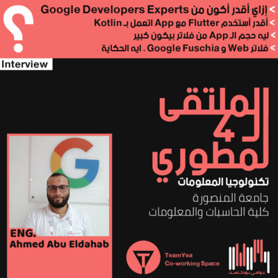 مقابلة مع المهندس أحمد أبو الدهب ضمن فعاليات الملتقي الرابع لمطوري تكنولوجيا المعلومات هنتكلم فيها عن : > إزاي أقدر أكون من Google Developers Experts > أقدر أستخدم Flutter مع App اتعمل بـ Kotlin > ليه حجم التطبيق من فلاتر بيكون كبير > ازاي أبدأ مع فلاتر ؟ > فلاتر Web و Google Fuschia ، ايه الحكاية وغيره كتير تقدر تعرفه من الانترفيو الانترفيو ده تم تسجيله كجزء من تغطية TeamYea Co-working Space بالتعاون مع Awamy Podcast للملتقي الرابع لمطوري تكنولوجيا المعلومات اللي تم في جامعة المنصوره كلية الحاسبات والمعلومات تابعنا علي Facebook : facebook.com/AwamyPodcast Twitter : twitter.com/AwamyPodcast Instagram : instagram.com/awamypodcast الحلقه علي باقي البلاتفورمز http://smarturl.it/AwamyPod